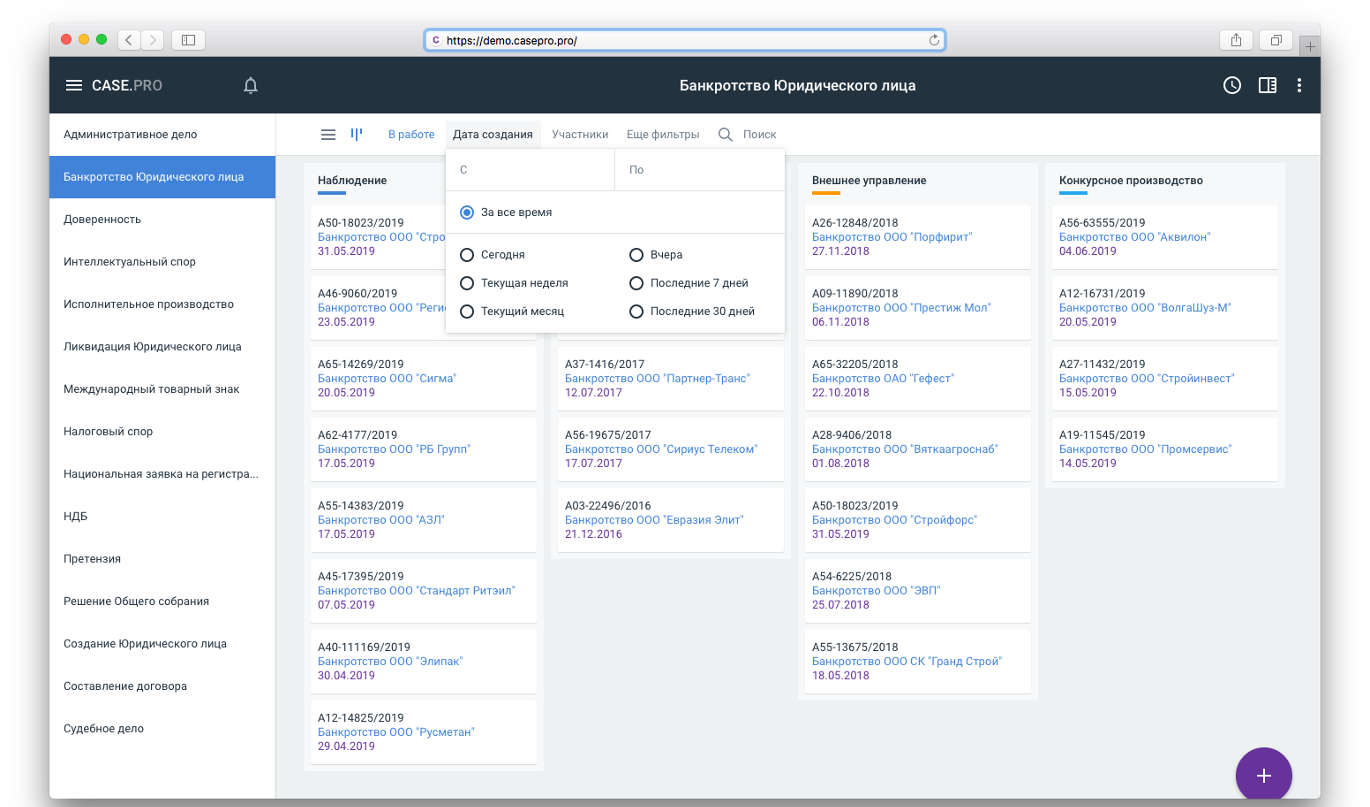 - Ведение дел и проектов в единой системе, включая управление судебными делами, претензионной работой, договорами, лицензиями, доверенностями, взысканиями, проверками и т.д.