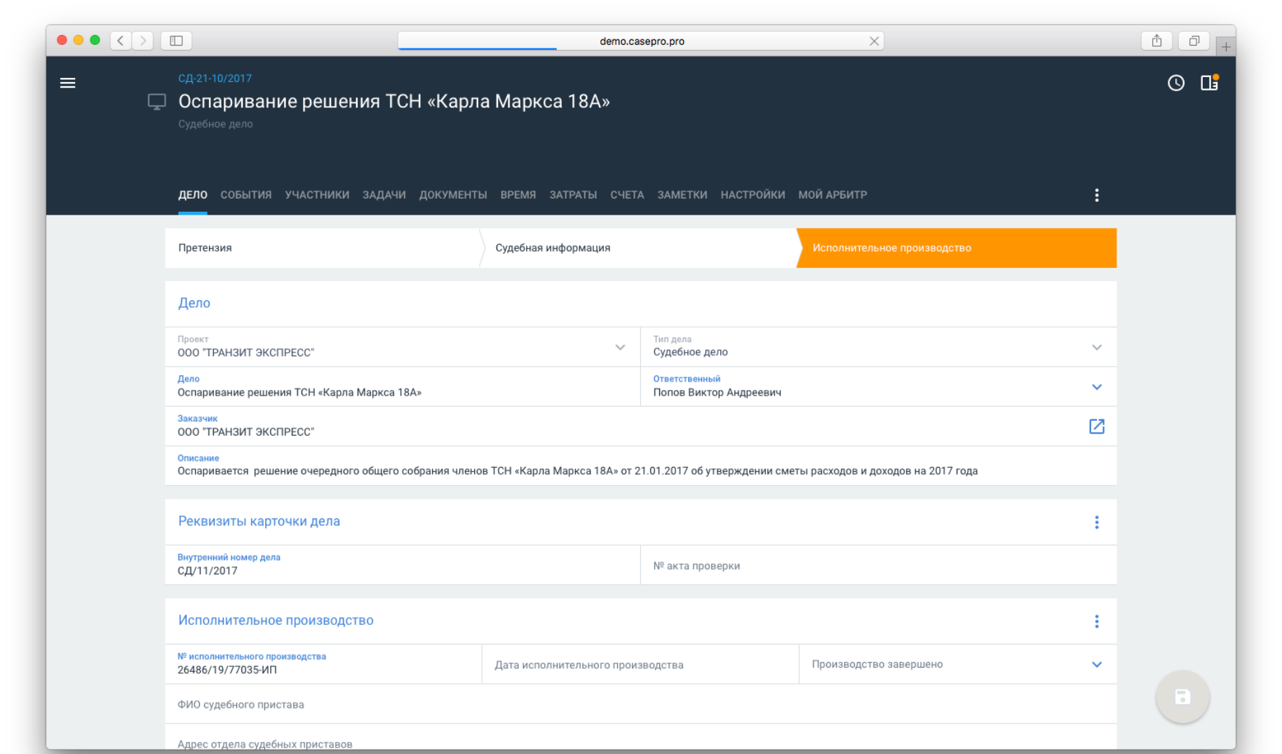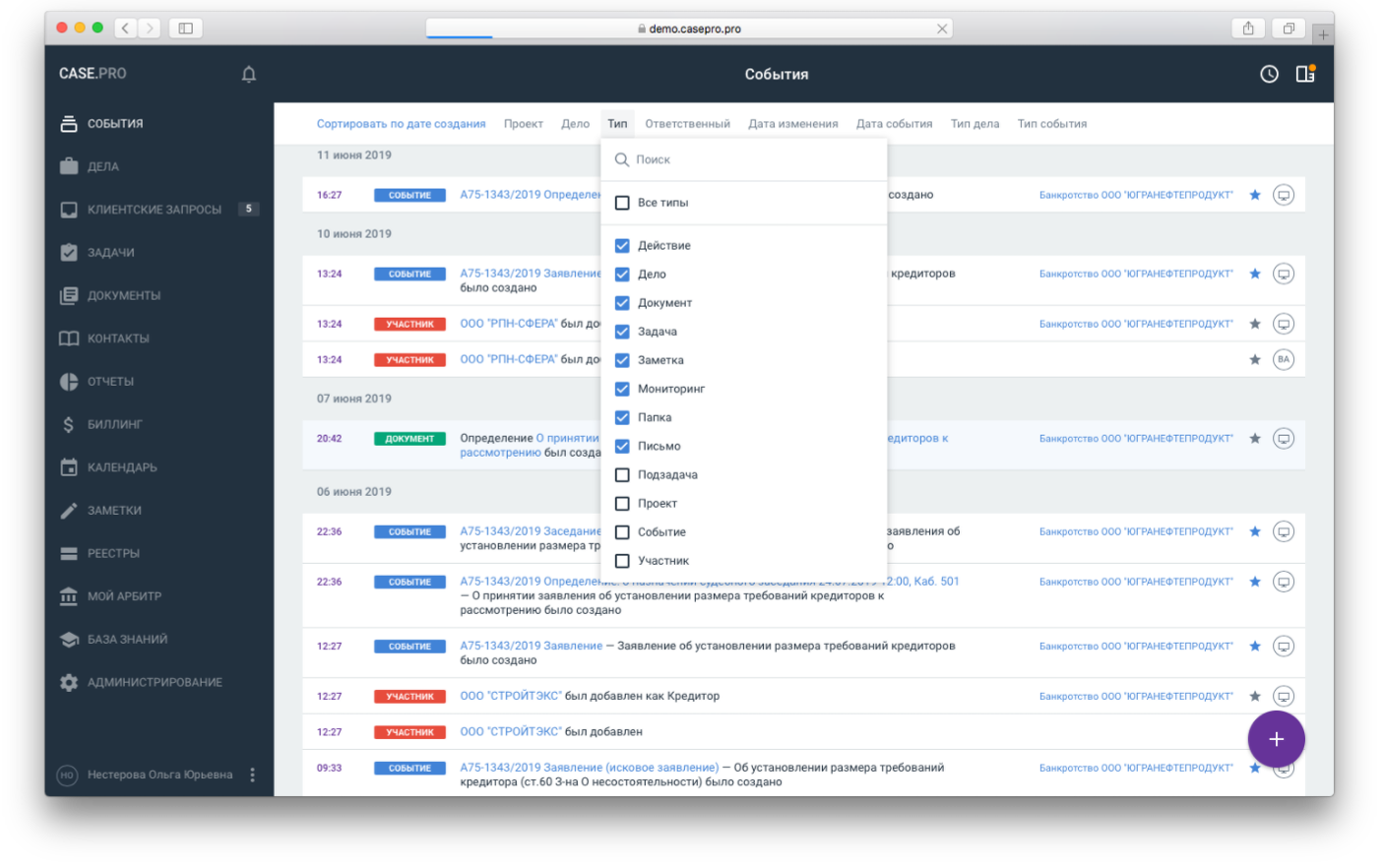 - Возможность предоставить доступ к актуальным сведениям и статусу по делу для заказчика через клиентский портал