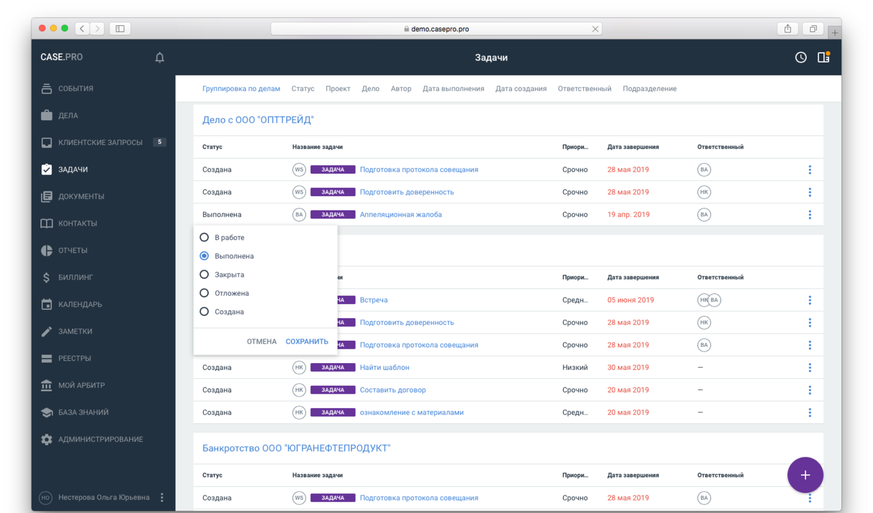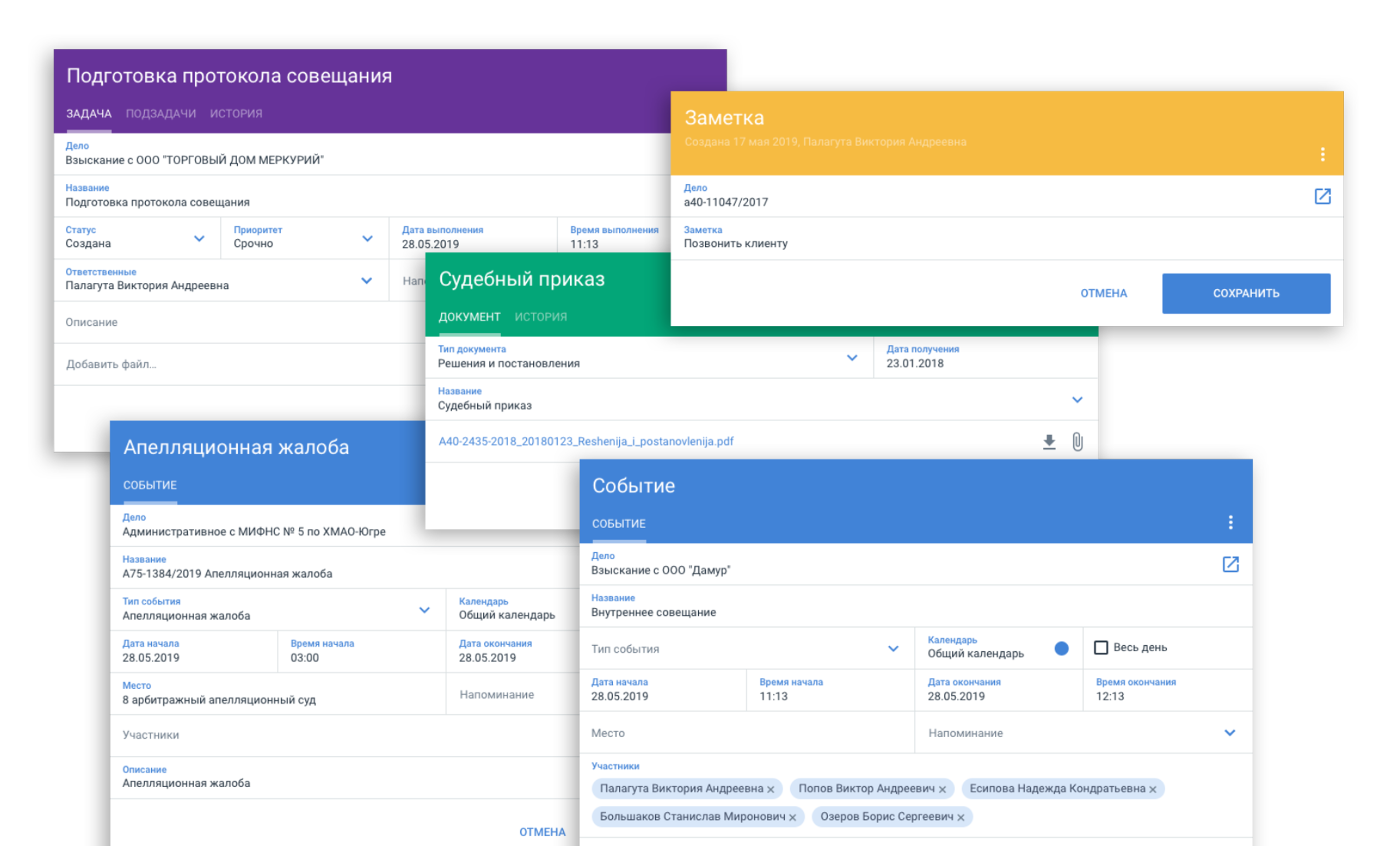 - Быстрая и безопасная передача дел между юристами без потери информации
