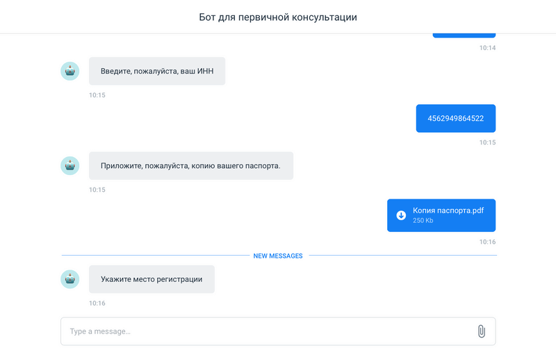 - Сбор любых видов информации, включая контактные данные, документы и фотографии, в режиме диалога с ботом
