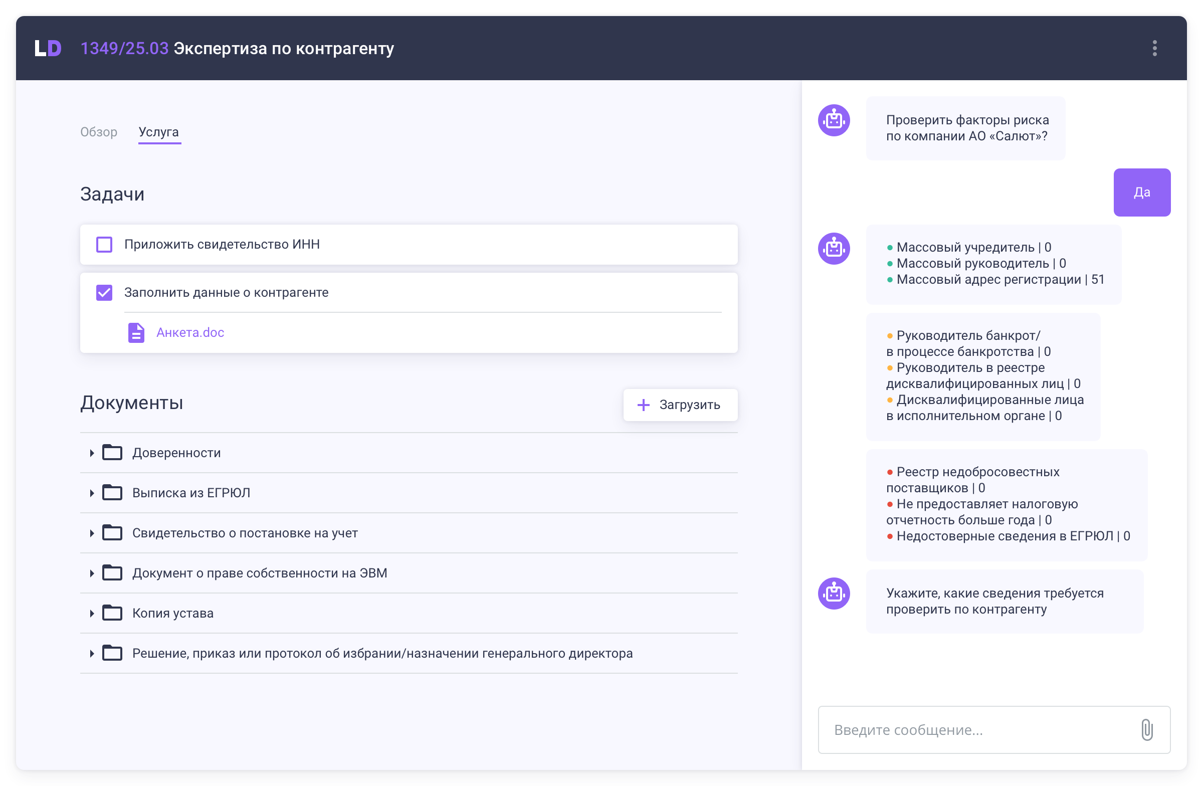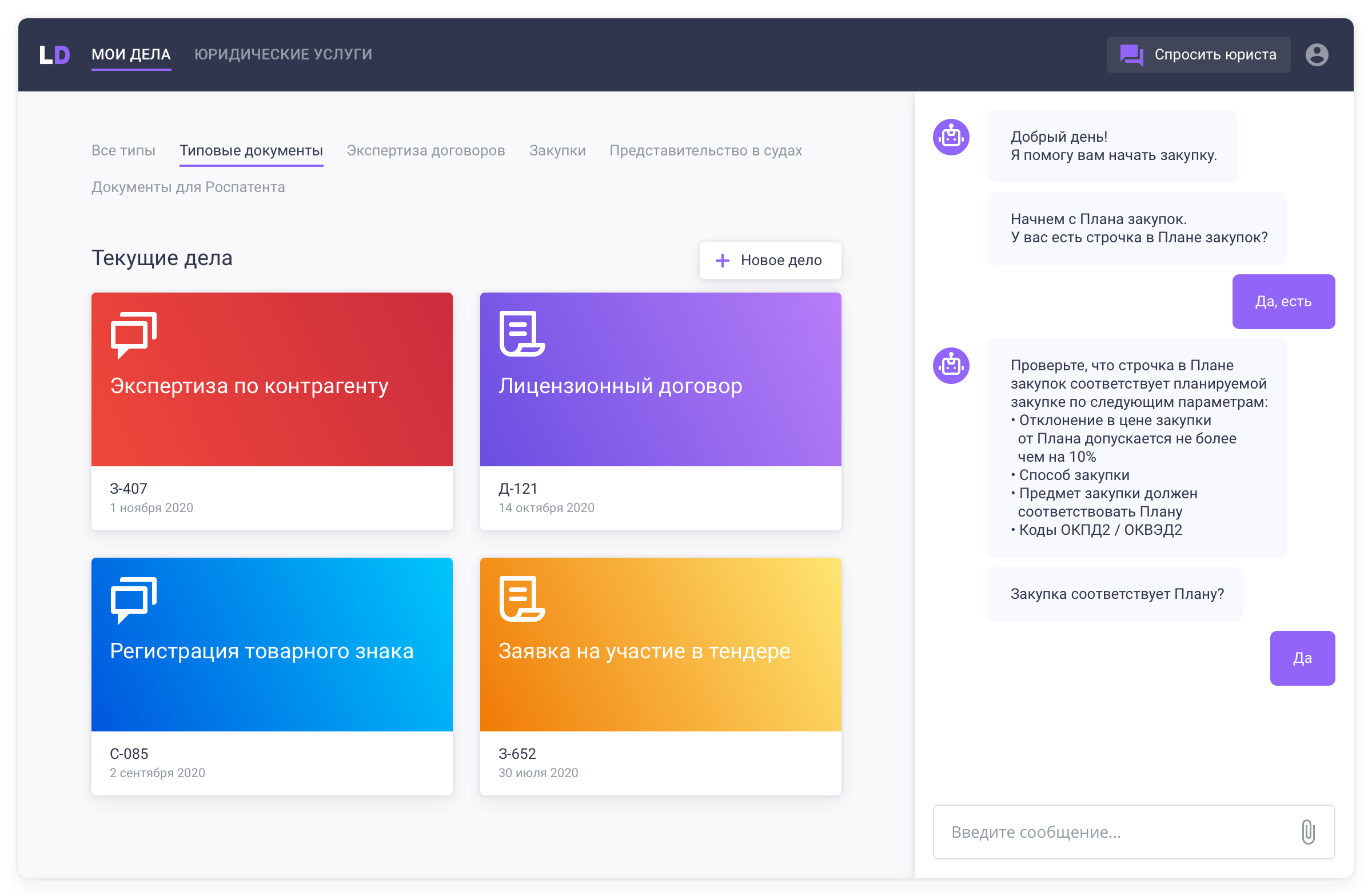Low-code платформа, которая позволяет в едином окне автоматизировать самые ресурсоемкие задачи юристов: учет и ведение дел, составление документов, типовые консультации, а также создать для заказчиков роботизированный Service Desk для типовых запросов.